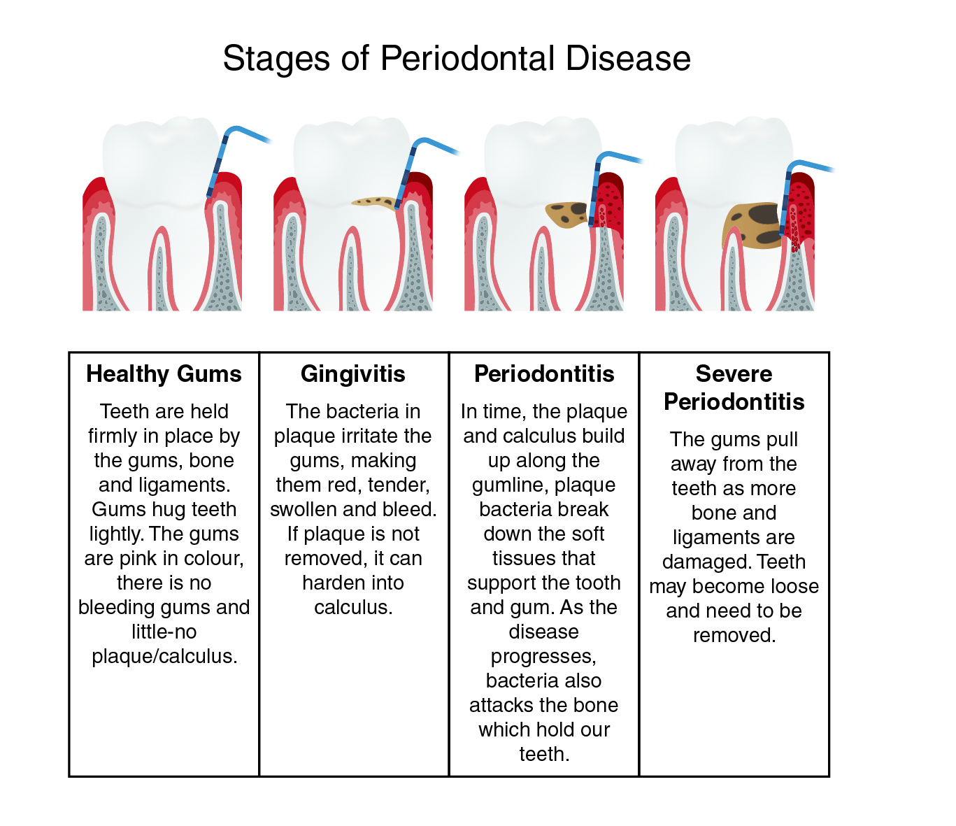 Stages of periodontal disease are described below: