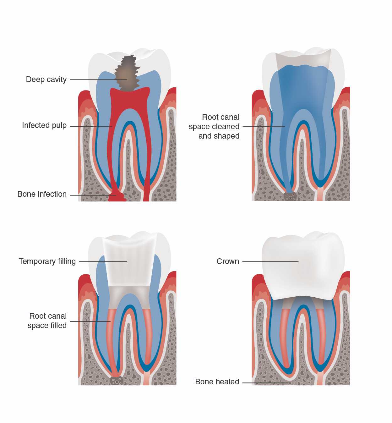 When the pulp is diseased or injured, your body will attempt to repair and heal itself. However, if it cannot repair the diseased or injured pulp, the pulp dies. This is normally caused by bacteria gaining access to the pulp chamber through a fractured tooth or a deep cavity, which can expose the pulp to the bacteria found in your saliva. The presence of bacteria in the pulp causes an infection inside the tooth. Left untreated, this infection can form an abscess, a build-up of infectious material (pus) at the root tip, eventually causing the pulp to die, and the supporting bone surrounding the tooth will be destroyed.